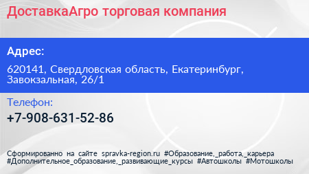 ДоставкаАгро, торговая компания по адресу 620141, Свердловская область, Екатеринбург, Завокзальная, 26/1 в дальнейшем Организация, размещена в следующих категориях: