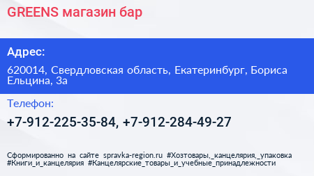 GREENS, магазин-бар по адресу 620014, Свердловская область, Екатеринбург, Бориса Ельцина, 3а в дальнейшем Организация, размещена в следующих категориях: