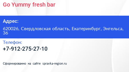 Go Yummy fresh bar по адресу 620026, Свердловская область, Екатеринбург, Энгельса, 36 в дальнейшем Организация, размещена в следующих категориях: