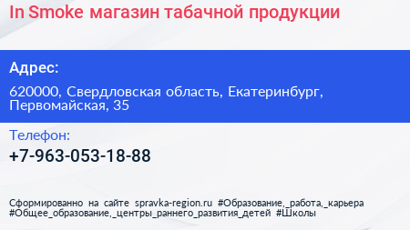 In Smoke, магазин табачной продукции по адресу 620000, Свердловская область, Екатеринбург, Первомайская, 35 в дальнейшем Организация, размещена в следующих категориях: