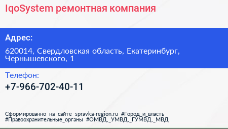 IqoSystem, ремонтная компания по адресу 620014, Свердловская область, Екатеринбург, Чернышевского, 1 в дальнейшем Организация, размещена в следующих категориях: