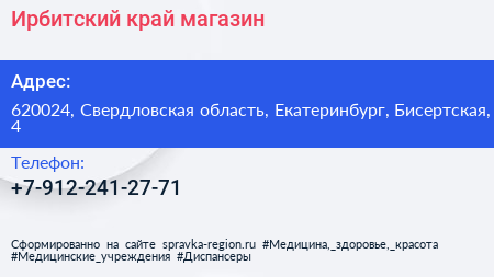 Ирбитский край, магазин по адресу 620024, Свердловская область, Екатеринбург, Бисертская, 4 в дальнейшем Организация, размещена в следующих категориях: