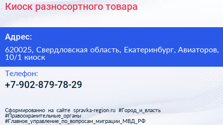 Киоск разносортного товара по адресу 620025, Свердловская область, Екатеринбург, Авиаторов, 10/1 киоск в дальнейшем Организация, размещена в следующих категориях: