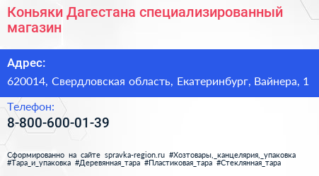 Коньяки Дагестана, специализированный магазин по адресу 620014, Свердловская область, Екатеринбург, Вайнера, 1 в дальнейшем Организация, размещена в следующих категориях: