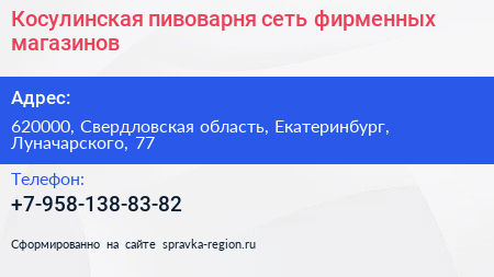 Косулинская пивоварня, сеть фирменных магазинов по адресу 620000, Свердловская область, Екатеринбург, Луначарского, 77 в дальнейшем Организация, размещена в следующих категориях: