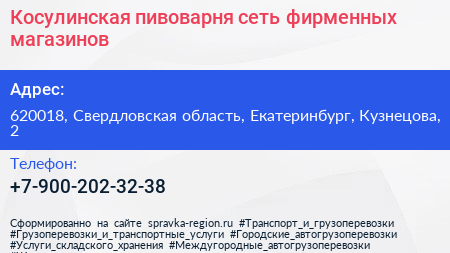 Косулинская пивоварня, сеть фирменных магазинов по адресу 620018, Свердловская область, Екатеринбург, Кузнецова, 2 в дальнейшем Организация, размещена в следующих категориях:
