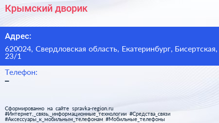 Крымский дворик по адресу 620024, Свердловская область, Екатеринбург, Бисертская, 23/1 в дальнейшем Организация, размещена в следующих категориях:
