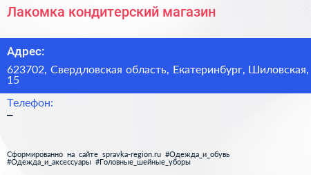 Лакомка, кондитерский магазин по адресу 623702, Свердловская область, Екатеринбург, Шиловская, 15 в дальнейшем Организация, размещена в следующих категориях: