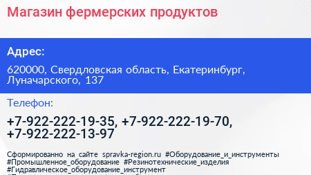 Магазин фермерских продуктов по адресу 620000, Свердловская область, Екатеринбург, Луначарского, 137 в дальнейшем Организация, размещена в следующих категориях: