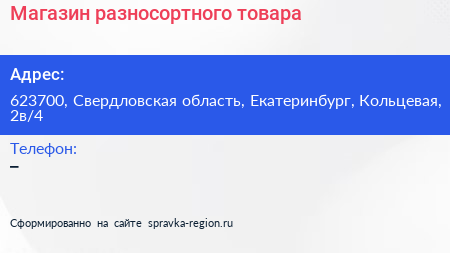 Магазин разносортного товара по адресу 623700, Свердловская область, Екатеринбург, Кольцевая, 2в/4 в дальнейшем Организация, размещена в следующих категориях: