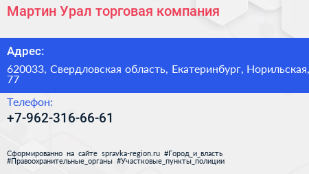 Мартин Урал, торговая компания по адресу 620033, Свердловская область, Екатеринбург, Норильская, 77 в дальнейшем Организация, размещена в следующих категориях: