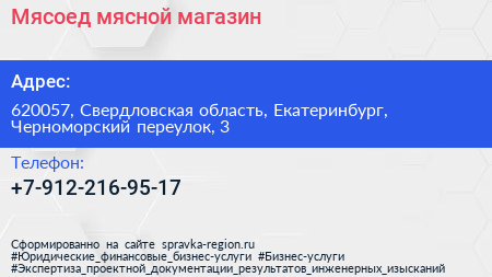 Мясоед, мясной магазин по адресу 620057, Свердловская область, Екатеринбург, Черноморский переулок, 3 в дальнейшем Организация, размещена в следующих категориях:
