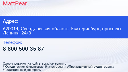 MattPear по адресу 620014, Свердловская область, Екатеринбург, проспект Ленина, 24/8 в дальнейшем Организация, размещена в следующих категориях:
