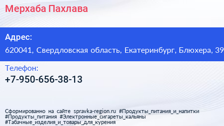 Мерхаба Пахлава по адресу 620041, Свердловская область, Екатеринбург, Блюхера, 39 в дальнейшем Организация, размещена в следующих категориях: