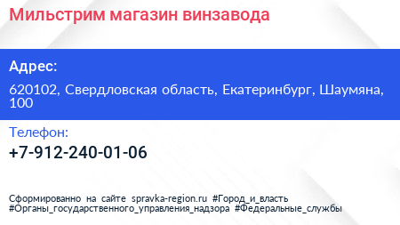Мильстрим, магазин винзавода по адресу 620102, Свердловская область, Екатеринбург, Шаумяна, 100 в дальнейшем Организация, размещена в следующих категориях: