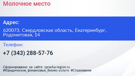 Молочное место по адресу 620073, Свердловская область, Екатеринбург, Родонитовая, 14 в дальнейшем Организация, размещена в следующих категориях: