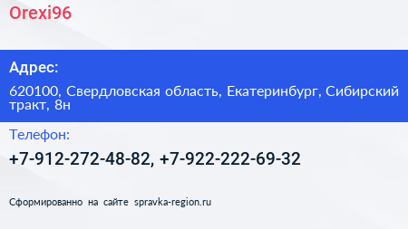 Orexi96 по адресу 620100, Свердловская область, Екатеринбург, Сибирский тракт, 8н в дальнейшем Организация, размещена в следующих категориях: