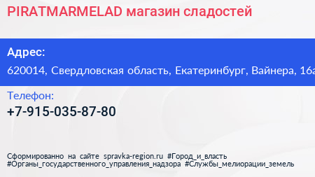 PIRATMARMELAD, магазин сладостей по адресу 620014, Свердловская область, Екатеринбург, Вайнера, 16а в дальнейшем Организация, размещена в следующих категориях: