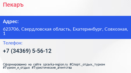 Пекаръ по адресу 623706, Свердловская область, Екатеринбург, Совхозная, 1 в дальнейшем Организация, размещена в следующих категориях: