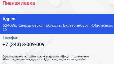 Пивная лавка по адресу 624096, Свердловская область, Екатеринбург, Юбилейная, 15 в дальнейшем Организация, размещена в следующих категориях: