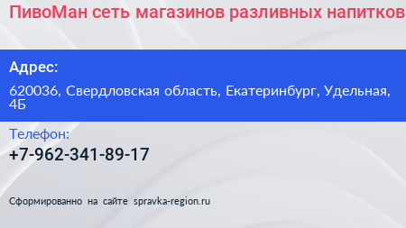 ПивоМан, сеть магазинов разливных напитков по адресу 620036, Свердловская область, Екатеринбург, Удельная, 4Б в дальнейшем Организация, размещена в следующих категориях: