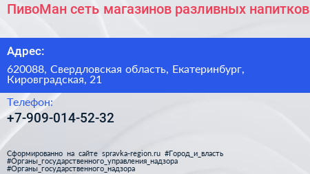 ПивоМан, сеть магазинов разливных напитков по адресу 620088, Свердловская область, Екатеринбург, Кировградская, 21 в дальнейшем Организация, размещена в следующих категориях: