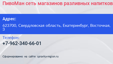 ПивоМан, сеть магазинов разливных напитков по адресу 623700, Свердловская область, Екатеринбург, Восточная, 3 в дальнейшем Организация, размещена в следующих категориях:
