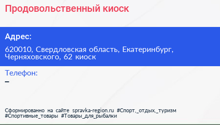 Продовольственный киоск по адресу 620010, Свердловская область, Екатеринбург, Черняховского, 62 киоск в дальнейшем Организация, размещена в следующих категориях: