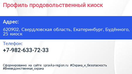 Профиль, продовольственный киоск по адресу 620902, Свердловская область, Екатеринбург, Будённого, 25 киоск в дальнейшем Организация, размещена в следующих категориях: