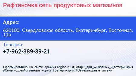 Рефтяночка, сеть продуктовых магазинов по адресу 620100, Свердловская область, Екатеринбург, Восточная, 11в в дальнейшем Организация, размещена в следующих категориях: