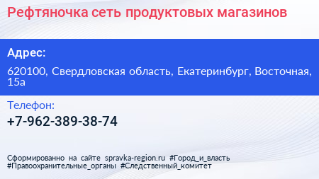 Рефтяночка, сеть продуктовых магазинов по адресу 620100, Свердловская область, Екатеринбург, Восточная, 15а в дальнейшем Организация, размещена в следующих категориях: