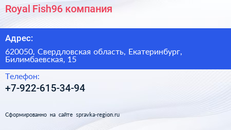 Royal-Fish96, компания по адресу 620050, Свердловская область, Екатеринбург, Билимбаевская, 15 в дальнейшем Организация, размещена в следующих категориях: