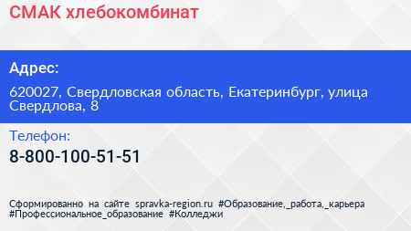 СМАК, хлебокомбинат по адресу 620027, Свердловская область, Екатеринбург, улица Свердлова, 8 в дальнейшем Организация, размещена в следующих категориях: