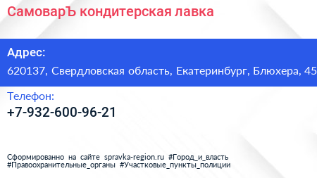 СамоварЪ, кондитерская лавка по адресу 620137, Свердловская область, Екатеринбург, Блюхера, 45 в дальнейшем Организация, размещена в следующих категориях: