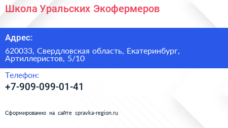 Школа Уральских Экофермеров по адресу 620033, Свердловская область, Екатеринбург, Артиллеристов, 5/10 в дальнейшем Организация, размещена в следующих категориях: