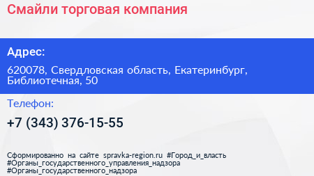 Смайли, торговая компания по адресу 620078, Свердловская область, Екатеринбург, Библиотечная, 50 в дальнейшем Организация, размещена в следующих категориях: