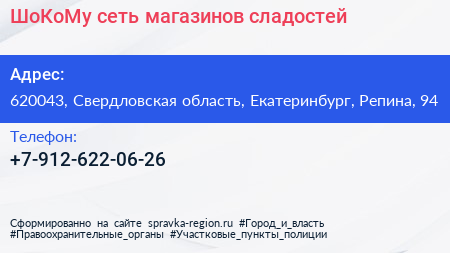 ШоКоМу, сеть магазинов сладостей по адресу 620043, Свердловская область, Екатеринбург, Репина, 94 в дальнейшем Организация, размещена в следующих категориях: