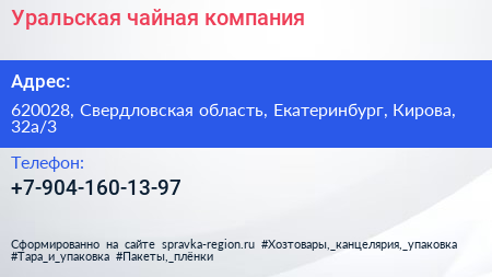 Уральская чайная компания по адресу 620028, Свердловская область, Екатеринбург, Кирова, 32а/3 в дальнейшем Организация, размещена в следующих категориях: