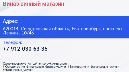 Виназ, винный магазин по адресу 620014, Свердловская область, Екатеринбург, проспект Ленина, 10/46 в дальнейшем Организация, размещена в следующих категориях: