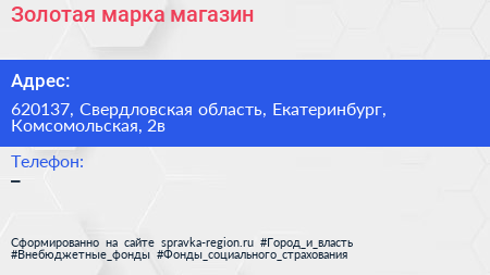 Золотая марка, магазин по адресу 620137, Свердловская область, Екатеринбург, Комсомольская, 2в в дальнейшем Организация, размещена в следующих категориях: