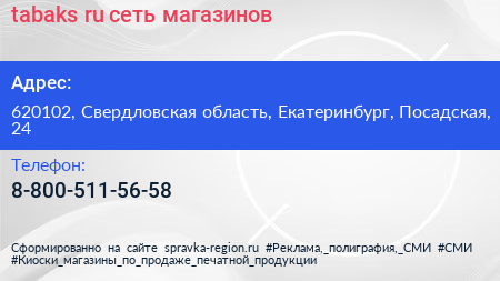 tabaks.ru, сеть магазинов по адресу 620102, Свердловская область, Екатеринбург, Посадская, 24 в дальнейшем Организация, размещена в следующих категориях: