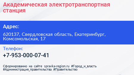 Академическая, электротранспортная станция по адресу 620137, Свердловская область, Екатеринбург, Комсомольская, 17 в дальнейшем Организация, размещена в следующих категориях: