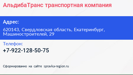 АльдибаТранс, транспортная компания по адресу 620143, Свердловская область, Екатеринбург, Машиностроителей, 29 в дальнейшем Организация, размещена в следующих категориях: