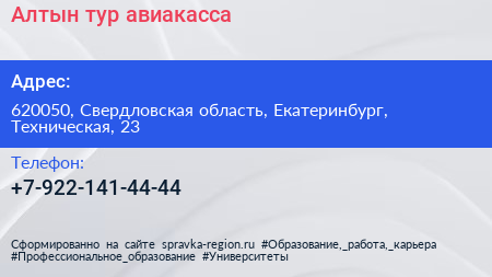 Алтын-тур, авиакасса по адресу 620050, Свердловская область, Екатеринбург, Техническая, 23 в дальнейшем Организация, размещена в следующих категориях: