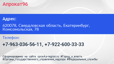 Апрокат96 по адресу 620078, Свердловская область, Екатеринбург, Комсомольская, 78 в дальнейшем Организация, размещена в следующих категориях: