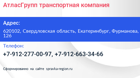 АтласГрупп, транспортная компания по адресу 620102, Свердловская область, Екатеринбург, Фурманова, 126 в дальнейшем Организация, размещена в следующих категориях: