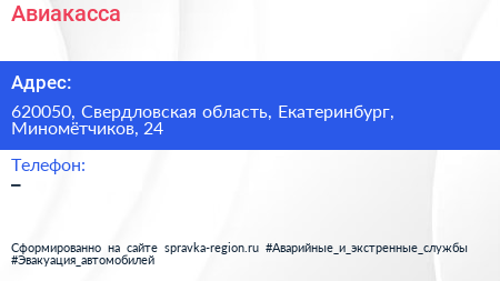Авиакасса по адресу 620050, Свердловская область, Екатеринбург, Миномётчиков, 24 в дальнейшем Организация, размещена в следующих категориях: