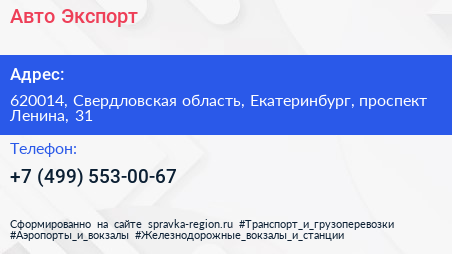 Авто-Экспорт по адресу 620014, Свердловская область, Екатеринбург, проспект Ленина, 31 в дальнейшем Организация, размещена в следующих категориях: