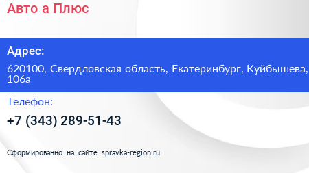 Авто а Плюс по адресу 620100, Свердловская область, Екатеринбург, Куйбышева, 106а в дальнейшем Организация, размещена в следующих категориях: