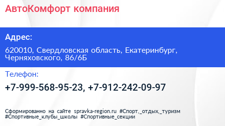 АвтоКомфорт, компания по адресу 620010, Свердловская область, Екатеринбург, Черняховского, 86/6Б в дальнейшем Организация, размещена в следующих категориях: